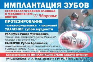 В Отрадном доступна такая услуга на высшем европейском уровне. Это просто настоящий подарок судьбы для наших горожан, что операции по имплантации в нашем городе проводят доктор Р.А. Хачатрян, имплантолог, челюстно-лицевой хирург европейского масштаба и главный врач самарской "Клиники Рахимова" Р.М.Рахимов, ортопед. Оба- профессионалы высочайшего класса.